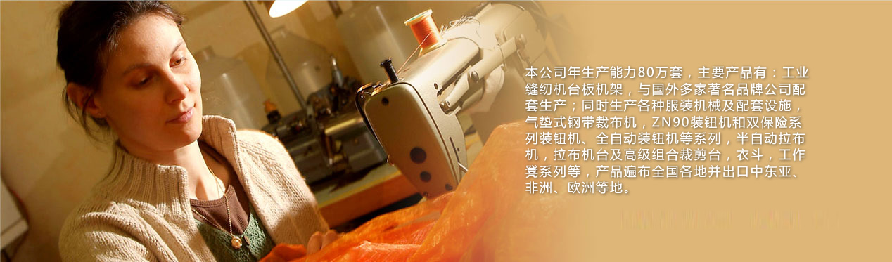 工業(yè)縫紉機臺板機架,與國外多家著名品牌公司配套生產(chǎn);同時生產(chǎn)各種服裝機械及配套設(shè)施,氣墊式鋼帶裁布機,ZN90裝鈕機和雙保險系列裝鈕機、全自動裝鈕機等系列,半自動拉布機,拉布機臺及高級組合裁剪臺,衣斗,工作凳系列等,產(chǎn)品遍布全國各地并出口中東亞、非洲、歐洲等地。